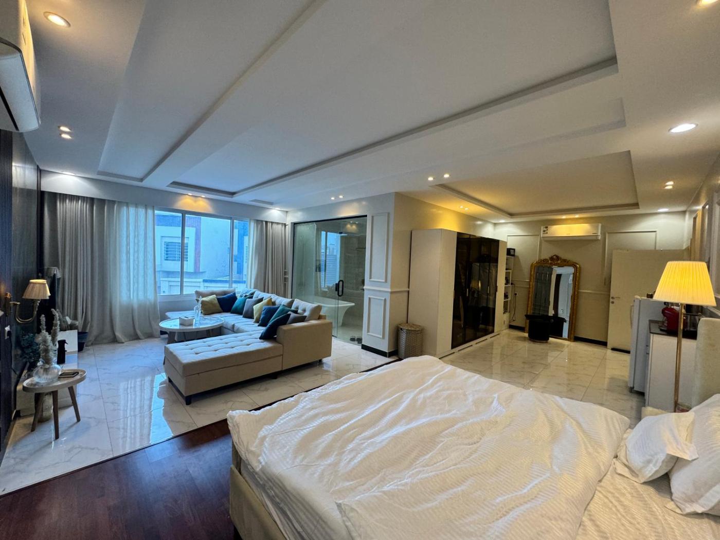 King Suite with Balcony. This spacious suite consists of 1 living room, 1 separate bedroom and 1 bathroom with a walk-in shower and free toiletries. The suites kitchenette, which has a refrigerator and an oven, is available for cooking and storing food. This suite is air-conditioned and features a seating area with a flat-screen TV, a washing machine, a private entrance, soundproof walls, as well as a tea and coffee maker. The unit offers 1 bed and 1 futon.
